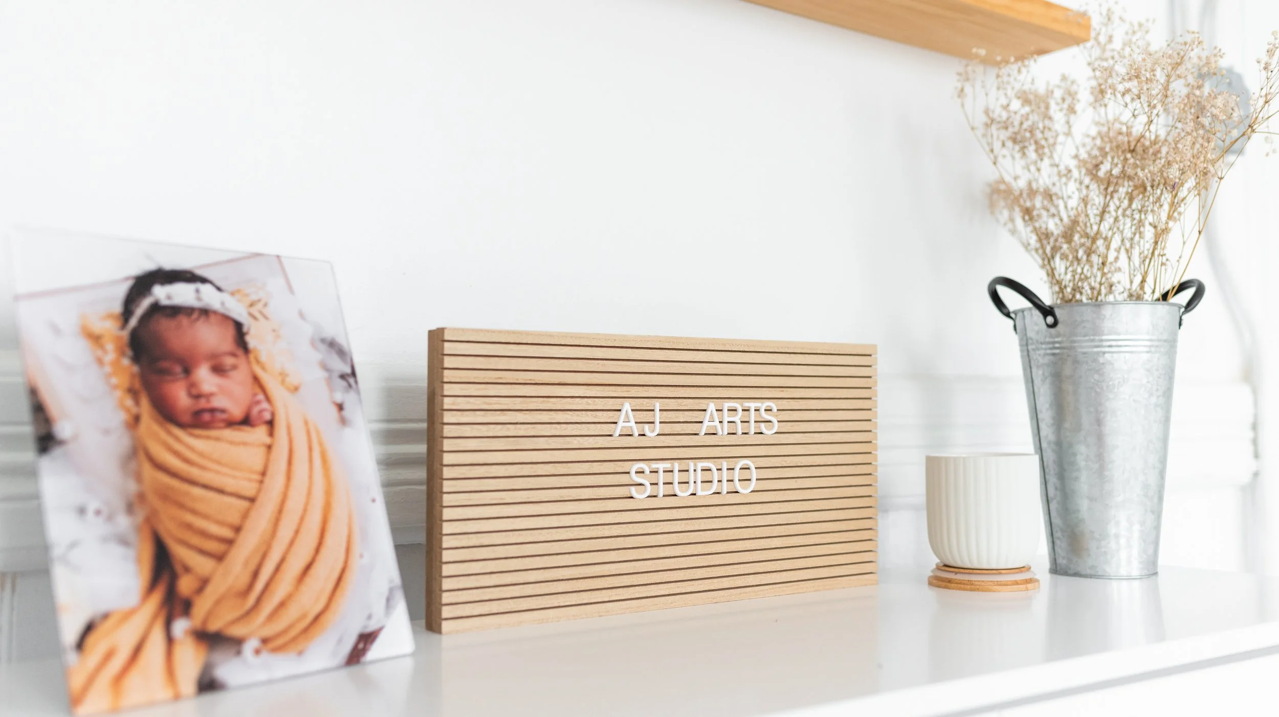White walls and floors make clean and classic portraits for an elegant and natural feel when photographing babies and maternity clients. AJ Arts has a client closet for expecting mothers, newborn babies, and one year old babes. Multiple newborn photography props and colorful, textured wraps for posing sweet baby in.